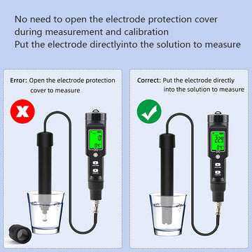 You can measure and calibrate without removing the electrode's protective cover. Simply immerse the electrode for quick, hassle-free usage, while the Automatic Temperature Compensation (ATC) feature ensures accurate results in a temperature range of 0-50?.