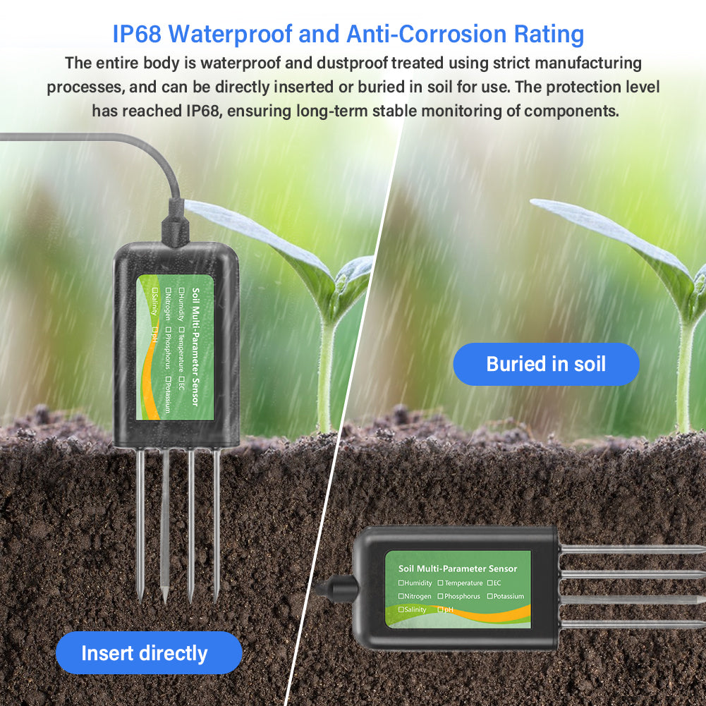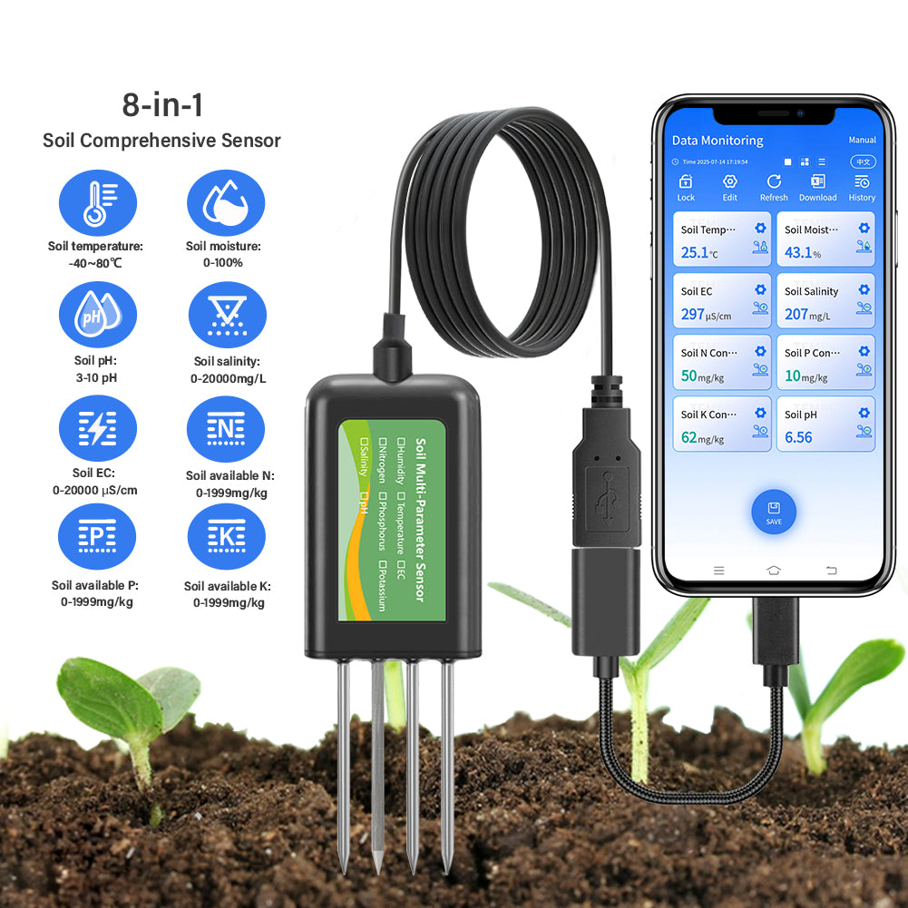 Monitor soil temperature, moisture, pH, EC, salinity, and NPK (Nitrogen, Phosphorus, Potassium) levels with one device.