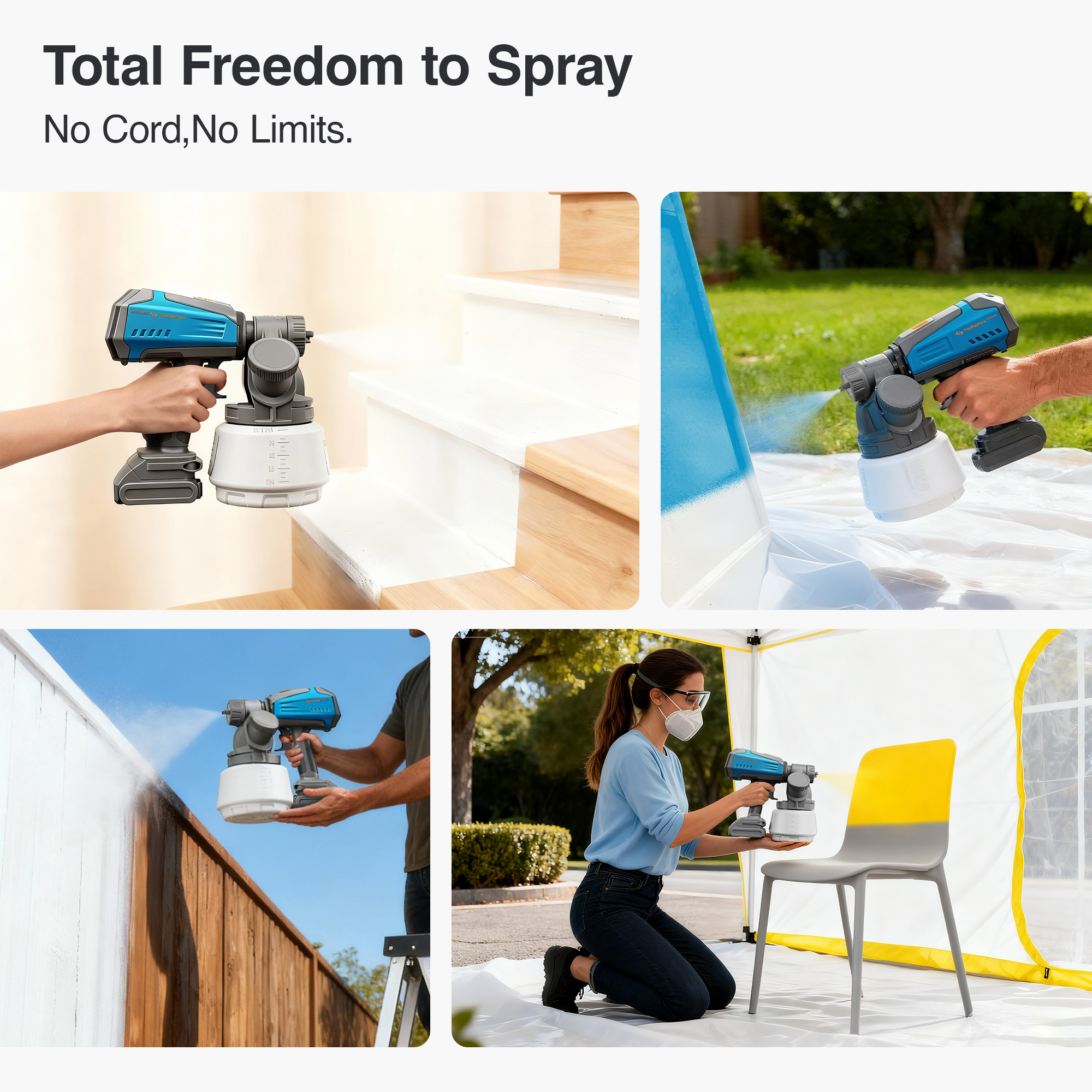 Enjoy complete freedom of movement with this cordless paint sprayer. Powered by compatible DeW 20V batteries (including DCB203, DCB204, DCB240, DCB206, DCB208, DCB609 and more, Battery Not Included), it is ideal for a wide range of indoor and outdoor projects like house painting, walls, fences, furniture, cabinets, doors, garage, and anywhere power outlets are out of reach.