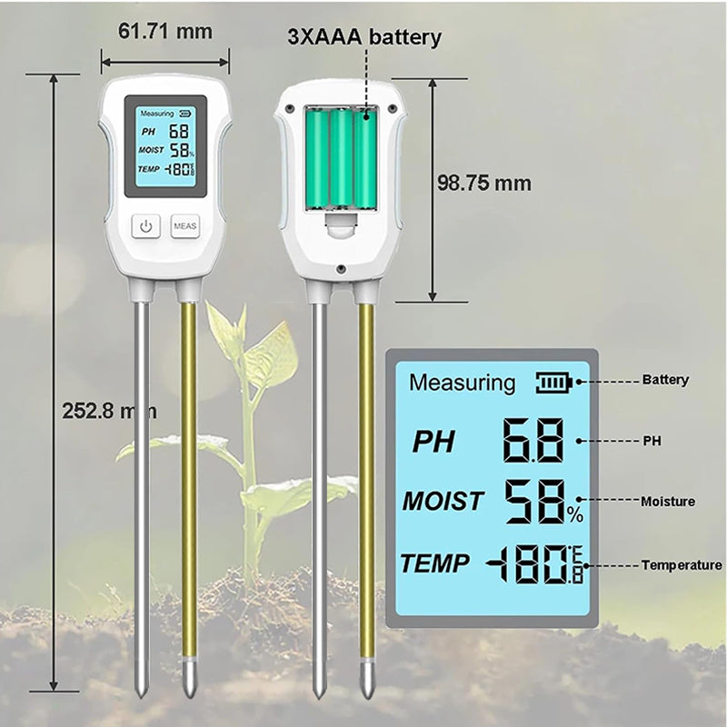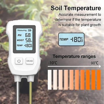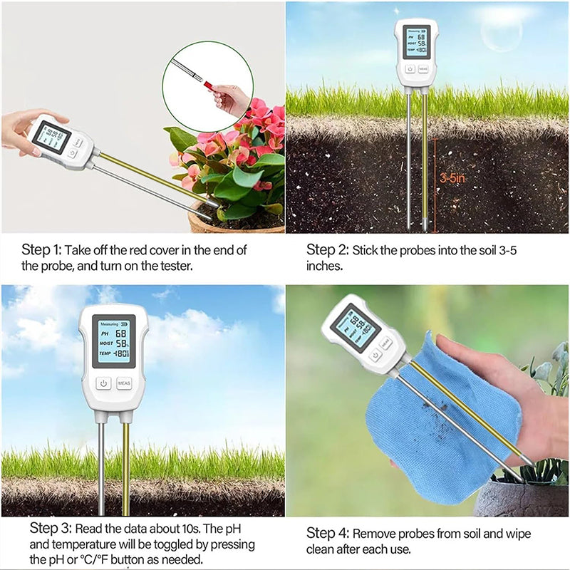 The soil thermometer features a digital LCD display that supports multi-screen display. With the backlight for enhanced visibility, you can easily read pH values and temperature readings.