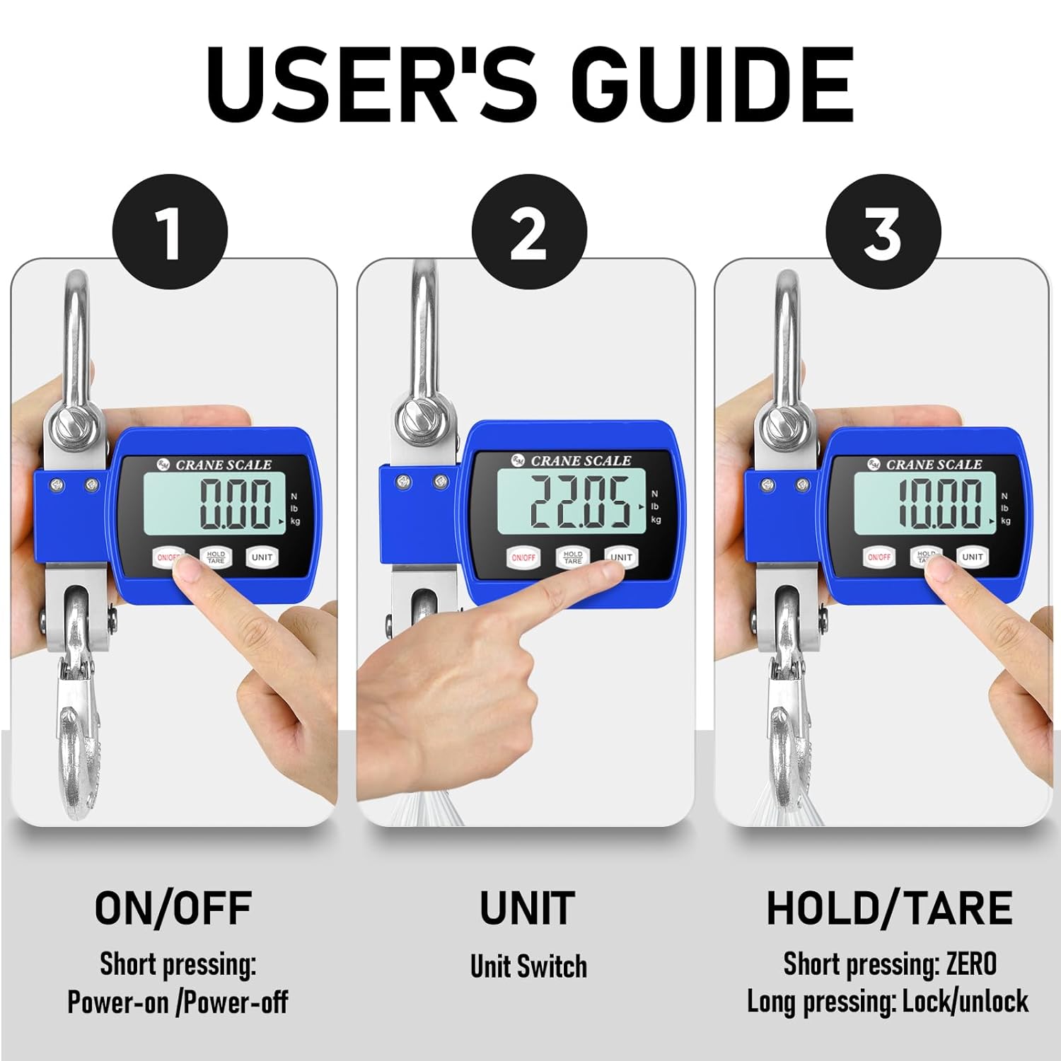 Press "UNIT" to switch from "kg" to "lb" to "N". Press "HOLD/TARE" to turn on or off hold readings function for further use. The increment is 0.05kg / 0.11lb / 0.5N. The accuracy is ±0.1%.